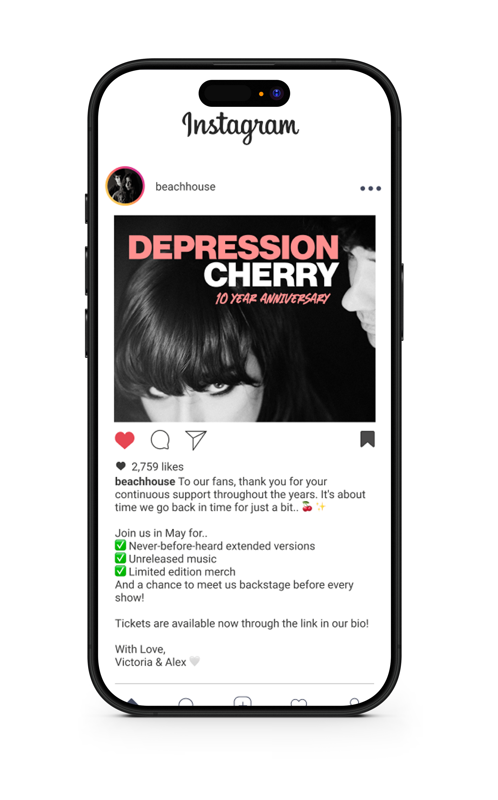 This campaign celebrates the 10th anniversary of their album Depression Cherry and aims to increase ticket sales for their upcoming shows. Deliverables include 3 posters, 2 Instagram posts, a billboard ad, and merch.